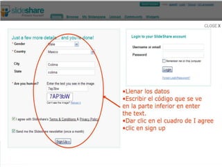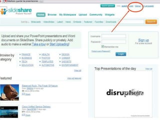 Slide Share es una aplicación web para almacenar presentaciones de diapositivas y compartirlas, permitiendo dar conferencias sin necesidad de cargar físicamente la presentación. Los usuarios pueden registrarse en Slide Share de forma gratuita y subir archivos de presentaciones.