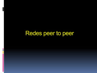 Este documento resume varias redes peer-to-peer y aplicaciones como Ares, Limewire, Skype, BitTorrent, uTorrent, eDonkey2000 y Napster. El documento describe brevemente que las redes peer-to-peer permiten el intercambio de archivos entre computadoras sin la necesidad de servidores centralizados, y menciona algunas de las aplicaciones más populares para descargar música, películas, y comunicarse a través de Internet usando estas redes.