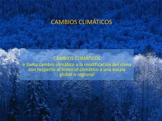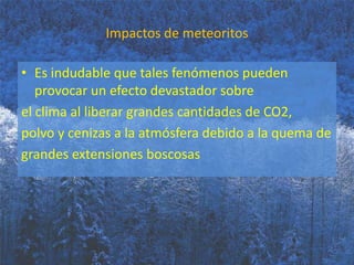 El documento describe diferentes causas del cambio climático, incluyendo impactos de meteoritos que liberan gases de efecto invernadero, las corrientes oceánicas que regulan el clima, y la quema de combustibles fósiles por el hombre que ha aumentado las temperaturas globales 0.5°C en los últimos 150 años y se espera que aumente aún más.