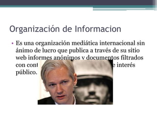 WikiLeaks es una organización mediática internacional sin fines de lucro que publica informes y documentos filtrados de interés público, ofreciéndose a recibir filtraciones que revelen comportamientos no éticos de gobiernos y compañías. Entre las filtraciones más relevantes de 2010 se encuentran videos de asesinatos de periodistas por soldados estadounidenses en Irak, diarios de la guerra de Afganistán y registros de la guerra de Irak que revelan torturas y cifras de víctimas civiles. La organización
