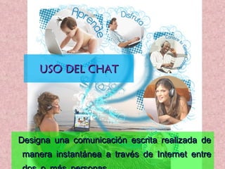 El documento describe los servicios de internet para el uso del chat. Explica que el chat permite la comunicación escrita instantánea entre dos o más personas de forma pública o privada. También describe el video chat y algunas expectativas del uso del chat en una asignatura, como facilitar la resolución de dudas y mejorar la interacción entre compañeros.