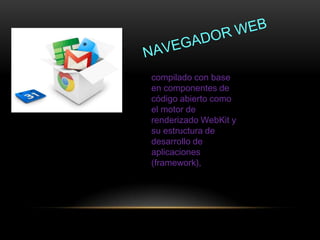 El documento describe la creación y características del navegador Google Chrome, destacando su uso de componentes de código abierto y su popularidad con más de 310 millones de usuarios a finales de 2012. Se mencionan sus características básicas como seguridad, estabilidad, y funcionalidades como pestañas, extensiones y sincronización en línea. También se hace referencia a su desarrollo basado en múltiples bibliotecas de código de Google y terceros.