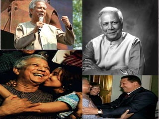 Muhammad Yunus nació en Bangladesh en 1940 y es un economista y banquero conocido por desarrollar el concepto de microcrédito y fundar el Banco Grameen. Recibió su doctorado en la Universidad Vanderbilt y fue profesor en Tennessee antes de crear pequeños préstamos para personas de bajos ingresos que no califican para préstamos bancarios tradicionales, lo que le valió el Premio Nobel de la Paz en 2006.