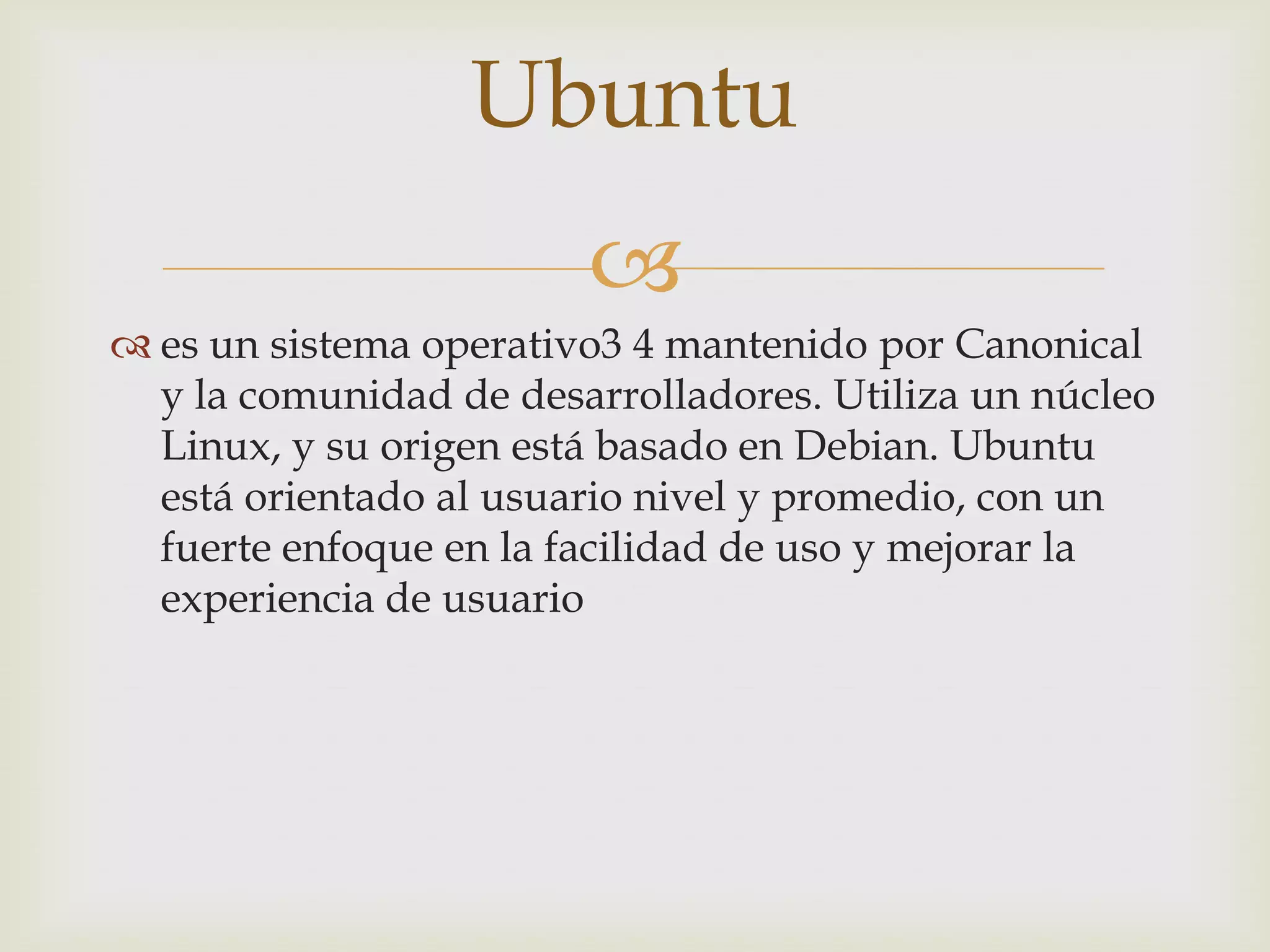 Ubuntu es un sistema operativo basado en Debian con un fuerte enfoque en la facilidad de uso. Es mantenido por Canonical y la comunidad de desarrolladores. Ofrece software libre y código abierto, y tiene aproximadamente el 49% del mercado de distribuciones Linux. Su interfaz de usuario principal es Unity, con barras superior e izquierda y un tablero de aplicaciones.