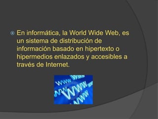 La World Wide Web es un sistema de distribución de información basado en hipertexto e hipermedios accesibles a través de Internet. Funciona traduciendo la dirección URL en una dirección IP usando DNS y midiendo la popularidad de un sitio web basado en el número de páginas vistas o peticiones de servidor. Existen varias tecnologías, navegadores y servidores web que facilitan el desarrollo y acceso a la información en la web.