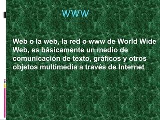 El World Wide Web fue creado en 1989 por Tim Berners-Lee y Robert Cailliau en el CERN para permitir la comunicación de texto, gráficos y otros objetos multimedia a través de Internet usando hipertextos y buscadores; estos últimos buscan la información más relevante aunque a veces no sea la correcta.