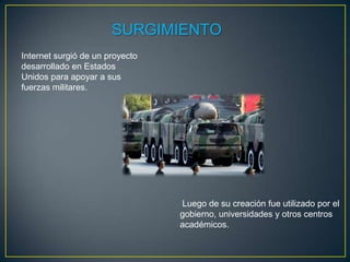 El internet surgió de un proyecto militar en EE. UU. y se expandió a gobiernos y universidades tras su creación. En 1969, se realizó la primera conexión de ordenadores a la ARPANET, y en 1972 se lanzó el correo electrónico, la primera aplicación significativa de la red. Desde entonces, el correo electrónico ha sido fundamental en el desarrollo de la comunicación en línea y precursora de la actual World Wide Web.