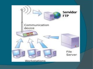 FTP es un protocolo de red que permite la transferencia de archivos entre sistemas conectados a través de un servidor FTP. Un servidor FTP es un programa que se ejecuta en un equipo servidor y permite compartir archivos. FTP tiene dos modos de transferencia: modo activo donde el servidor inicia las conexiones, y modo pasivo donde es el cliente quien las inicia.