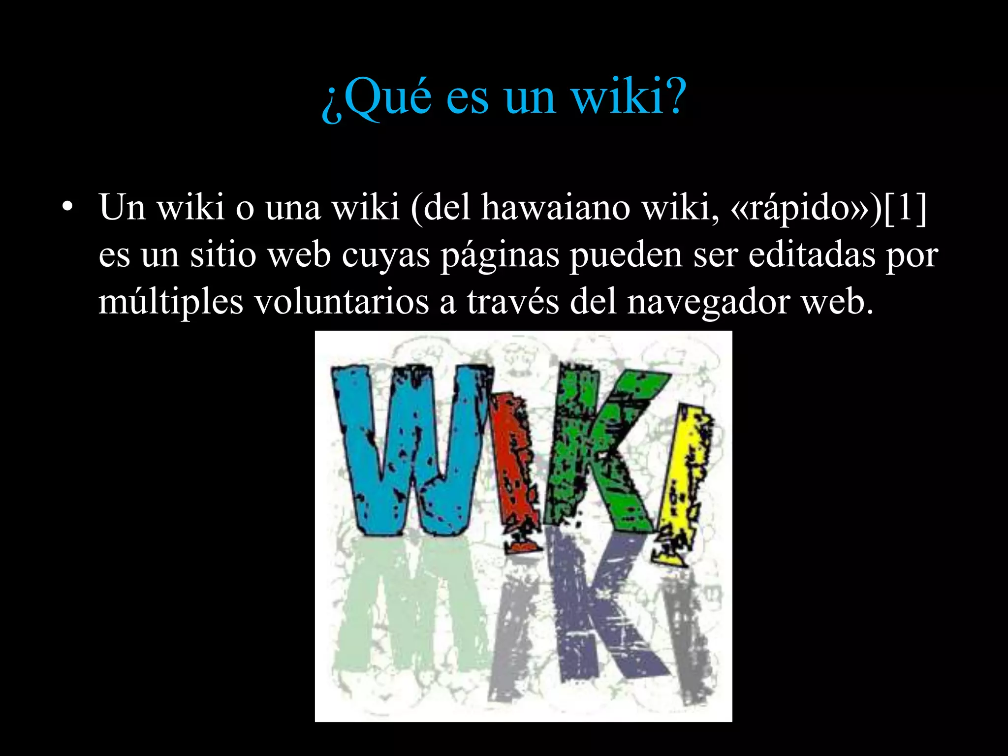 Un wiki es un sitio web cuyas páginas pueden ser editadas por múltiples usuarios a través de un navegador web, permitiendo que varios contribuyan al contenido de forma colaborativa. Los wikis conservan un historial de cambios que permite ver las diferentes versiones de una página y quién realizó cada modificación. Su objetivo es permitir que múltiples personas creen páginas sobre un tema para proporcionar información completa de forma colaborativa.