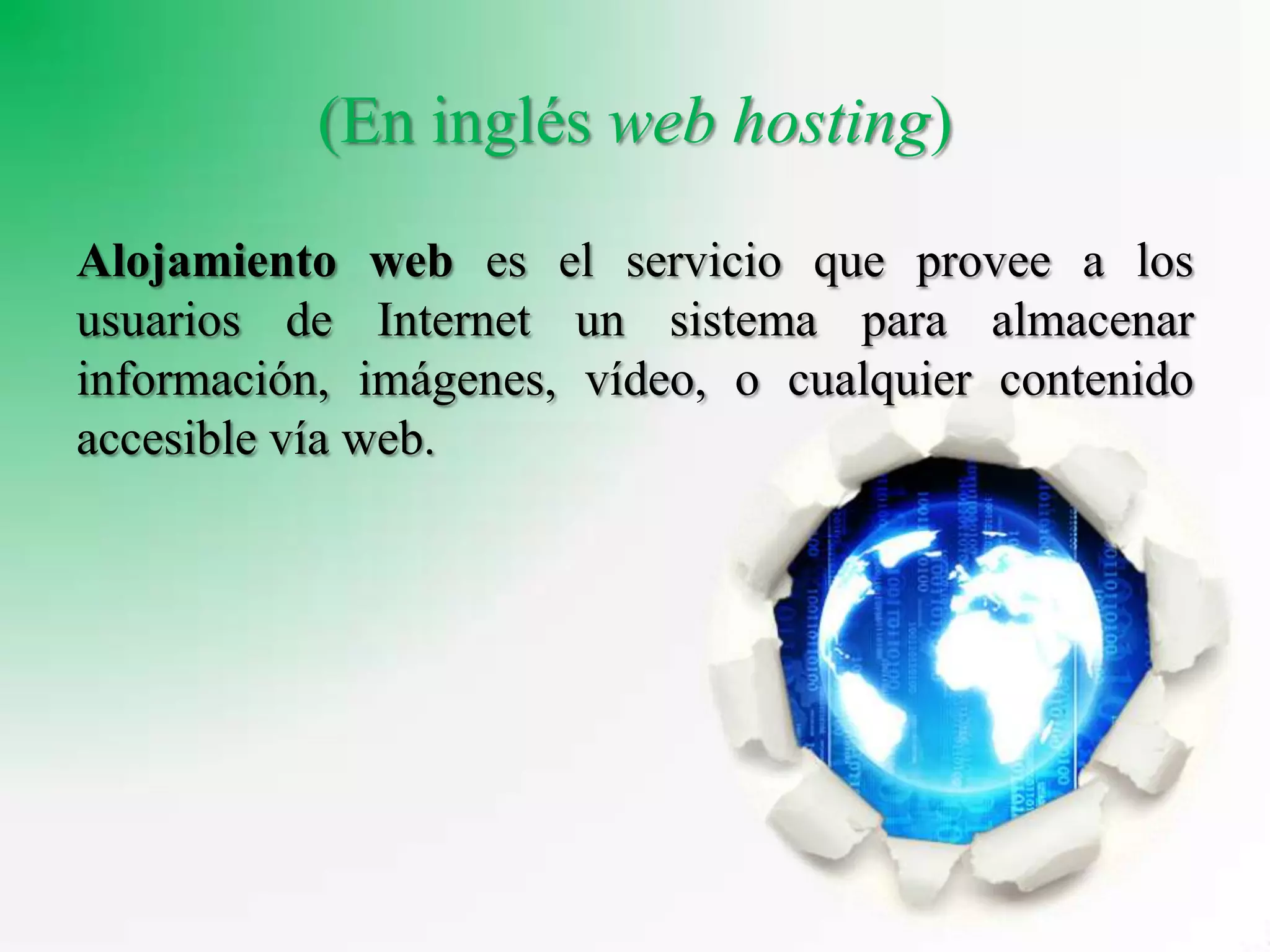 El documento describe los diferentes tipos de alojamiento web, incluyendo alojamiento compartido, gratuito, de imágenes, de pago, revendedor, servidores virtuales, dedicados y colocación. Explica que el alojamiento web proporciona espacio en un servidor para almacenar contenido en línea como páginas web, imágenes y videos. Los diferentes tipos varían en costo, recursos, control y flexibilidad.