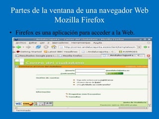 El resumen describe las principales partes de la ventana de un navegador web como Mozilla Firefox, incluyendo el menú principal, la barra de navegación, los marcadores, las pestañas, el contenido de la página, la barra de estado y la función de descargas.
