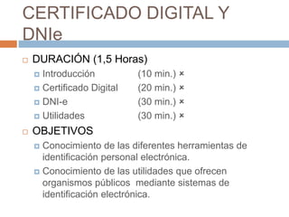 Este documento explica las herramientas de identificación electrónica como el certificado digital y el DNI electrónico (DNIe). Describe qué es un certificado digital, los tipos de certificados, cómo obtener uno y verificar su estado. Explica qué es un DNIe, para qué sirve, cómo instalarlo e iniciar sesión, y muestra ejemplos de su uso para firmar documentos electrónicos. Finalmente, resume algunas de las utilidades y servicios que ofrecen las administraciones públicas a través de estas herramientas de identificación.