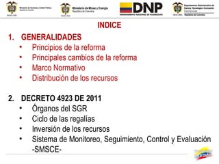 El documento resume los principios y cambios clave de la reforma al sistema de regalías de Colombia. Establece el marco normativo de la reforma y describe la distribución de los recursos de regalías a través de varios fondos como el Fondo de Ciencia, Tecnología e Innovación y el Fondo de Desarrollo Regional. También explica brevemente el funcionamiento del Sistema General de Regalías.