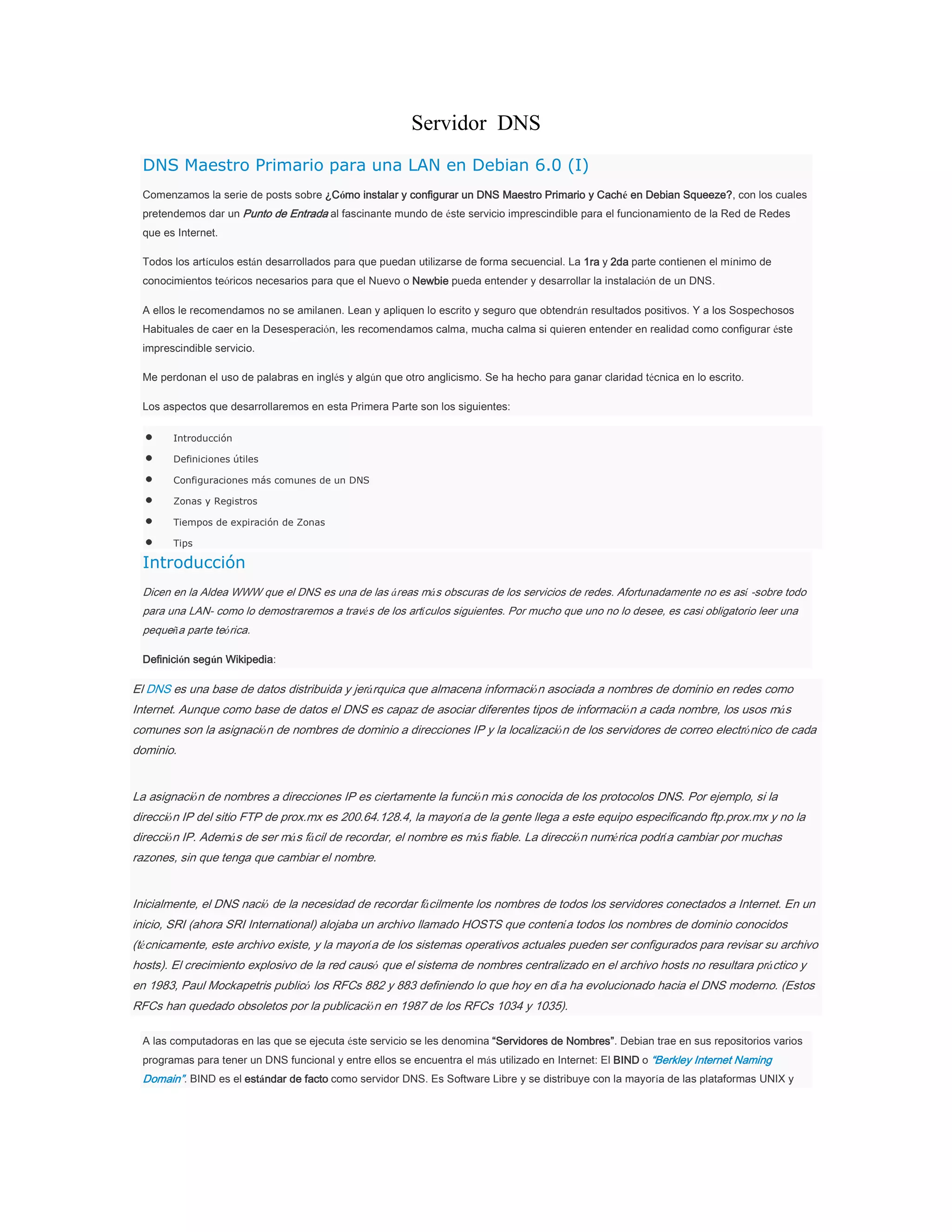 Este documento proporciona instrucciones para configurar un servidor DNS maestro primario en Debian 6.0. Explica conceptos básicos de DNS como zonas, registros y tiempos de expiración. También cubre la instalación de BIND, el software de servidor DNS más utilizado, y los directorios y archivos principales que crea BIND.