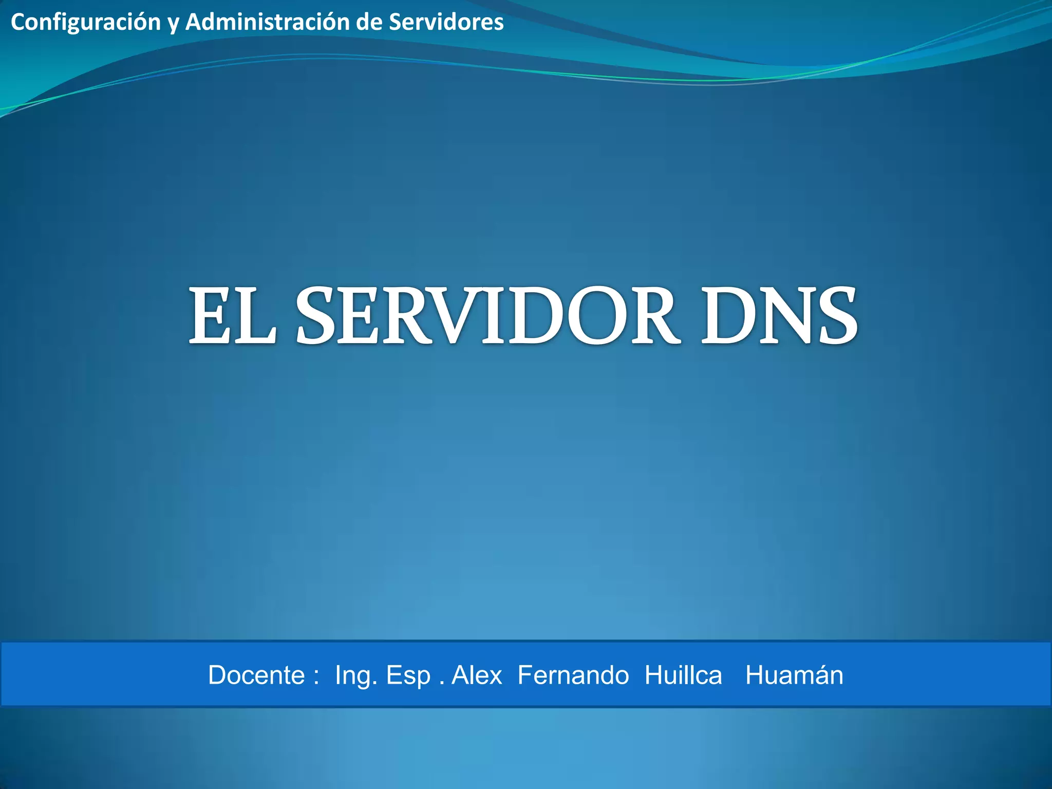 El documento habla sobre la configuración y administración de servidores DNS. Explica que el sistema de nombres de dominio permite asignar nombres basados en dominios y subdominios con una estructura jerárquica y que cada nombre corresponde a una dirección IP. También describe los conceptos de delegación de autoridad de dominios y las organizaciones responsables de administrar los servidores de nombres dentro de una zona de autoridad.