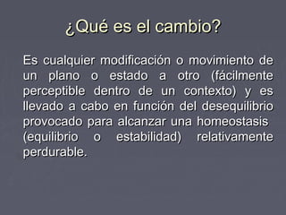 El documento describe la teoría del cambio planeado. Explica que el cambio es cualquier modificación de un estado a otro para alcanzar un nuevo equilibrio. El cambio planeado implica tres elementos: el sistema que cambia, un agente de cambio que apoya el proceso, y un estado deseado a alcanzar. El proceso de cambio planeado consta de cinco etapas: diagnóstico, determinación del estado deseado, determinación de acciones, ejecución, y evaluación. Finalmente, se mencionan algunas causas y resistencias comunes al cambio.