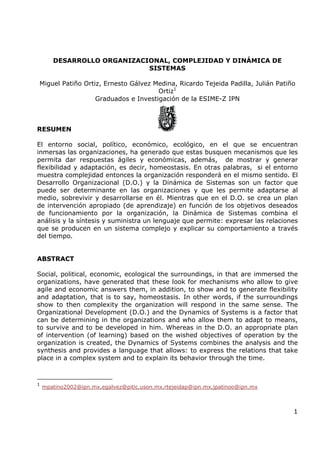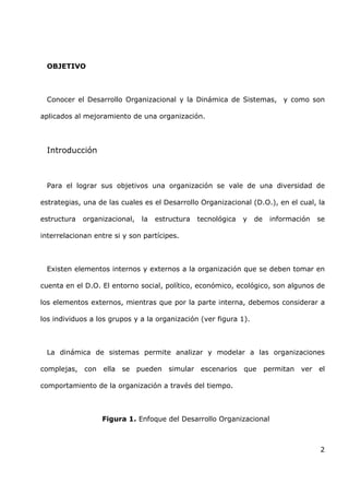 El desarrollo organizacional (D.O.) y la dinámica de sistemas son cruciales para que las organizaciones se adapten y respondan a la complejidad del entorno social, político y económico. Las organizaciones, consideradas como sistemas sociales complejos, deben integrar procesos de cambio planificados que les permitan mejorar su funcionamiento, responder a la incertidumbre y mantener homeostasis. A través de estrategias adecuadas, como la innovación tecnológica y la colaboración interna, las organizaciones pueden evolucionar y enfrentar con éxito los desafíos del medio ambiente.
