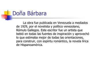 La novela Doña Bárbara, publicada en 1929 por Rómulo Gallegos, describe la vida en las llanuras venezolanas y presenta a Doña Bárbara, quien simboliza la tierra bravía, e indómita de Venezuela, y a Santos Luzardo, quien simboliza la nobleza y fuerza del pueblo que lucha para crear una nación. La novela examina la lucha entre la civilización y la barbarie en las extensas haciendas ganaderas y también presenta problemas sociales como el latifundio y el caciqu