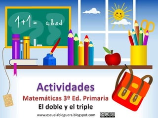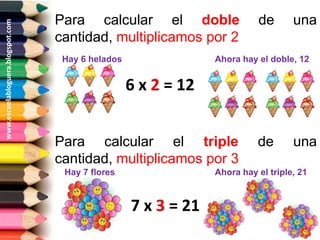 El documento explica cómo calcular el doble y el triple de una cantidad multiplicando por 2 o 3 respectivamente. Proporciona ejemplos de calcular el doble de 6 helados (12) y el triple de 7 flores (21). Luego pide al lector que calcule el doble y el triple de varias cantidades y los una con flechas.