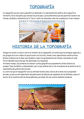 La topografía es la ciencia dedicada a representar gráficamente la superficie terrestre mediante la medición de puntos y sus coordenadas. Se originó en la antigua Grecia y Egipto y es fundamental para proyectos de construcción, ingeniería y más, ya que provee información detallada del terreno. Actualmente, se utilizan herramientas como estaciones totales y GPS para medir puntos y sus coordenadas tridimensionales y producir mapas topográficos.