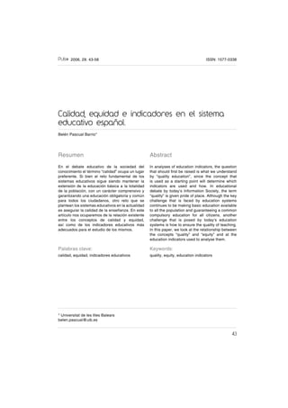 2006, 29. 43-58ISSN: 1577-0338 43 Calidad, equidad e indicadores en el sistema educativo español. Belén Pascual Barrio* Resumen En el debate educativo de la sociedad del conocimiento el término “calidad” ocupa un lugar preferente. Si bien el reto fundamental de los sistemas educativos sigue siendo mantener la extensión de la educación básica a la totalidad de la población, con un carácter comprensivo y garantizando una educación obligatoria y común para todos los ciudadanos, otro reto que se plantean los sistemas educativos en la actualidad es asegurar la calidad de la enseñanza. En este artículo nos ocuparemos de la relación existente entre los conceptos de calidad y equidad, así como de los indicadores educativos más adecuados para el estudio de los mismos. Palabras clave: calidad, equidad, indicadores educativos Abstract In analyses of education indicators, the question that should ſrst be raised is what we understand by “quality education”, since the concept that is used as a starting point will determine which indicators are used and how. In educational debate by today’s Information Society, the term “quality” is given pride of place. Although the key challenge that is faced by education systems continues to be making basic education available to all the population and guaranteeing a common compulsory education for all citizens, another challenge that is posed by today’s education systems is how to ensure the quality of teaching. In this paper, we look at the relationship between the concepts “quality” and “equity” and at the education indicators used to analyse them. Keywords: quality, equity, education indicators * Universitat de les Illes Balears belen.pascual@uib.es
