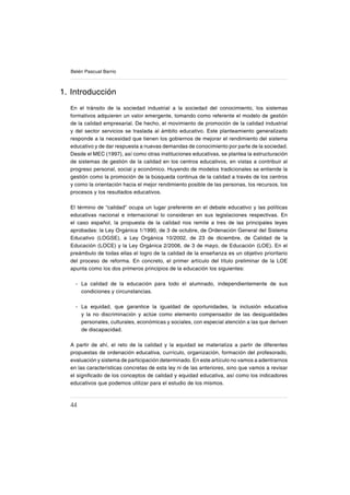 44 Belén Pascual Barrio 1.Introducción En el tránsito de la sociedad industrial a la sociedad del conocimiento, los sistemas formativos adquieren un valor emergente, tomando como referente el modelo de gestión de la calidad empresarial. De hecho, el movimiento de promoción de la calidad industrial y del sector servicios se traslada al ámbito educativo. Este planteamiento generalizado responde a la necesidad que tienen los gobiernos de mejorar el rendimiento del sistema educativo y de dar respuesta a nuevas demandas de conocimiento por parte de la sociedad. Desde el MEC (1997), así como otras instituciones educativas, se plantea la estructuración de sistemas de gestión de la calidad en los centros educativos, en vistas a contribuir al progreso personal, social y económico. Huyendo de modelos tradicionales se entiende la gestión como la promoción de la búsqueda continua de la calidad a través de los centros y como la orientación hacia el mejor rendimiento posible de las personas, los recursos, los procesos y los resultados educativos. El término de “calidad” ocupa un lugar preferente en el debate educativo y las políticas educativas nacional e internacional lo consideran en sus legislaciones respectivas. En el caso español, la propuesta de la calidad nos remite a tres de las principales leyes aprobadas: la Ley Orgánica 1/1990, de 3 de octubre, de Ordenación General del Sistema Educativo (LOGSE), a Ley Orgánica 10/2002, de 23 de diciembre, de Calidad de la Educación (LOCE) y la Ley Orgánica 2/2006, de 3 de mayo, de Educación (LOE). En el preámbulo de todas ellas el logro de la calidad de la enseñanza es un objetivo prioritario del proceso de reforma. En concreto, el primer artículo del título preliminar de la LOE apunta como los dos primeros principios de la educación los siguientes: La calidad de la educación para todo el alumnado, independientemente de sus condiciones y circunstancias. La equidad, que garantice la igualdad de oportunidades, la inclusión educativa y la no discriminación y actúe como elemento compensador de las desigualdades personales, culturales, económicas y sociales, con especial atención a las que deriven de discapacidad. A partir de ahí, el reto de la calidad y la equidad se materializa a partir de diferentes propuestas de ordenación educativa, currículo, organización, formación del profesorado, evaluación y sistema de participación determinado. En este artículo no vamos a adentrarnos en las características concretas de esta ley ni de las anteriores, sino que vamos a revisar el signiſcado de los conceptos de calidad y equidad educativa, así como los indicadores educativos que podemos utilizar para el estudio de los mismos. - -