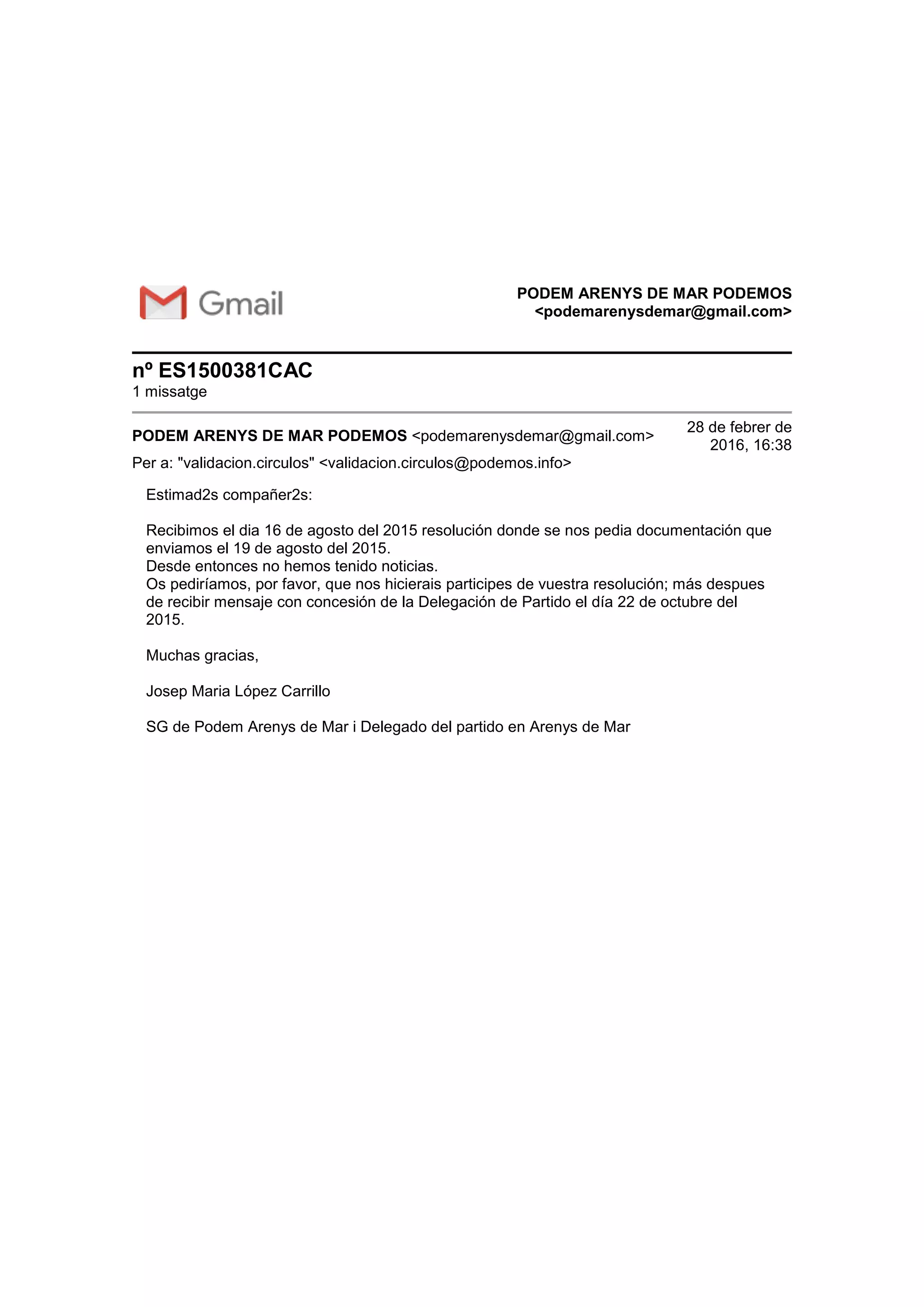 El círculo de Podemos de Arenys de Mar envió documentación solicitada en agosto de 2015 para su validación, pero desde entonces no han recibido noticias sobre su resolución. Solicitan que se les informe sobre el estado de su validación, especialmente después de haber recibido un mensaje en octubre de 2015 sobre la concesión de su delegación de partido.