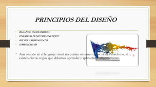 Este documento habla sobre los principios básicos del diseño como el balance, énfasis, ritmo y simplicidad. También discute la importancia de invertir en diseño para transmitir un concepto creativo y relacionar una marca con su público objetivo. Finalmente, recomienda varios programas en línea gratuitos para crear logotipos atractivos.