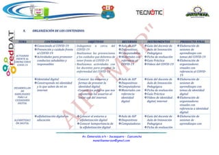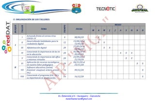 El documento describe la organización de 8 talleres que se llevarán a cabo de abril a diciembre del 2020. Los talleres abarcarán temas como prevención del COVID-19, ciudadanía digital, alfabetización digital y el uso de herramientas tecnológicas en la educación. Cada taller tendrá de 4 a 20 horas de duración en diferentes fechas.