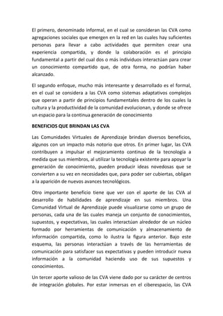 El documento describe las comunidades virtuales de aprendizaje (CVA), que permiten el aprendizaje impulsado por el estudiante a través de Internet. Las CVA ofrecen varios beneficios, como mejorar continuamente la tecnología, desarrollar habilidades de aprendizaje y servir como centros de integración global. Sin embargo, para ser estructuras robustas, las CVA deben abordar problemas como la organización interna, la maduración gradual, la sensibilidad cultural y los aspectos tecnológicos. Se espera que las CVA