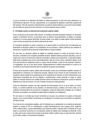 Este documento propone una reforma al sistema de educación superior en Chile. Argumenta que el modelo actual, basado en la filosofía del Estado mínimo y el mercado, ha fallado, resultando en baja calidad educativa y desigualdad. Propone fortalecer el pilar público de la educación superior a través de un mayor financiamiento estatal a las universidades públicas, con el objetivo de que sirvan mejor al desarrollo nacional y proporcionen educación de calidad con equidad. Los rectores de universidades estatales buscan cambiar el paradigma hacia