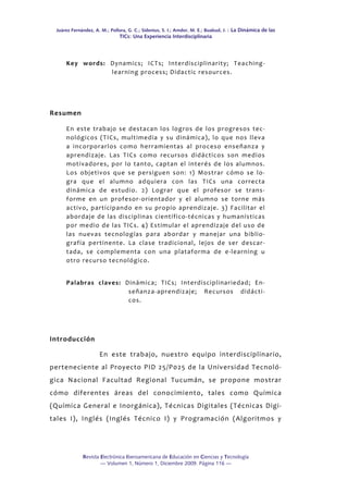 Este documento describe una experiencia interdisciplinaria que utilizó las TIC como recursos didácticos en varias asignaturas como Química, Técnicas Digitales, Inglés y Programación. El objetivo fue mostrar cómo las TIC potencian los procesos de enseñanza y aprendizaje al hacer que los estudiantes sean más activos y colaborativos en la construcción de su conocimiento. La metodología aplicó un enfoque descriptivo e interdisciplinario para analizar los resultados en cada asignatura.