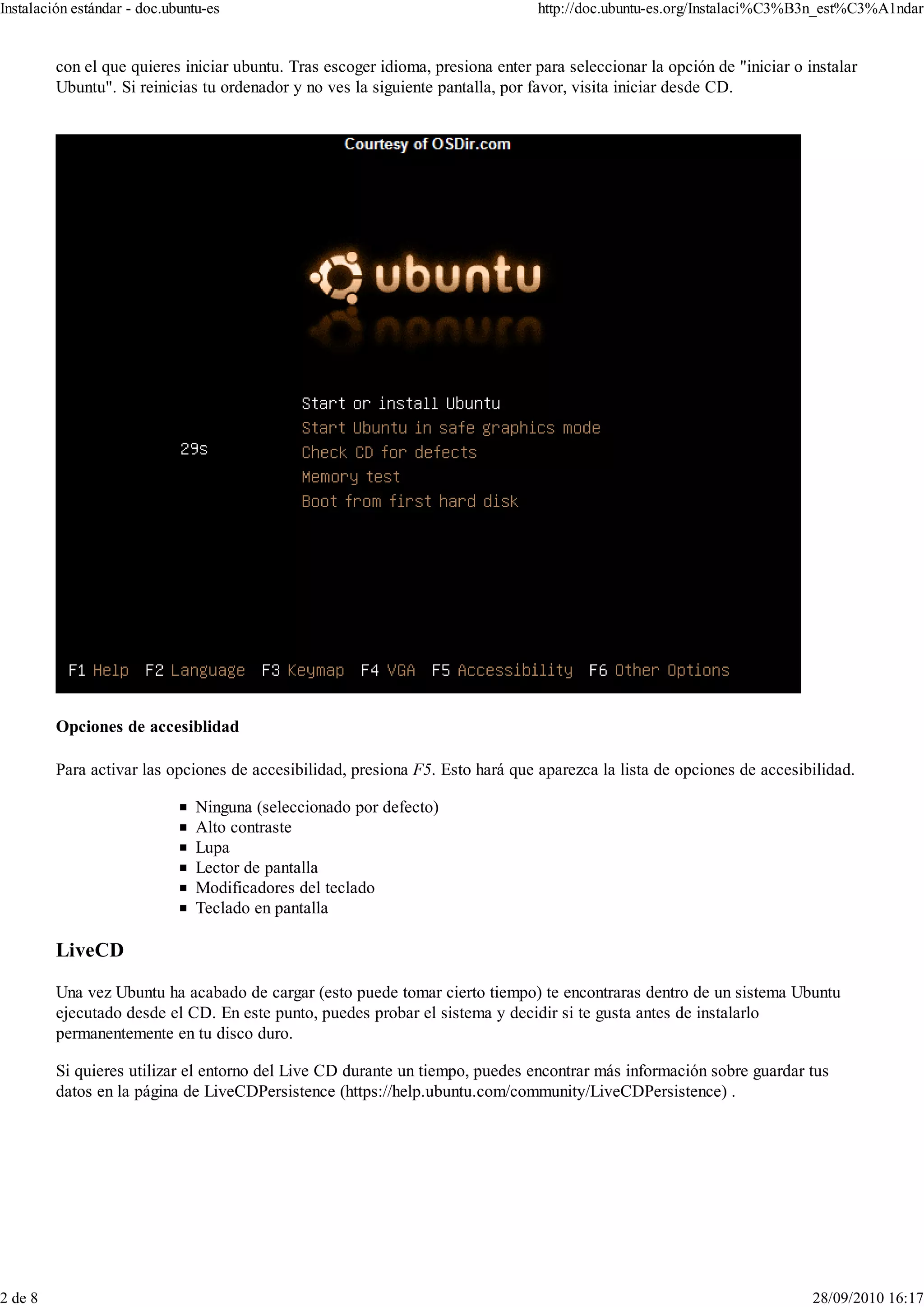 Este documento proporciona instrucciones para instalar Ubuntu mediante el método estándar de instalación utilizando un CD de instalación. Explica los pasos de la instalación, incluyendo obtener el CD de instalación, probar la conexión a Internet, seleccionar el idioma, zona horaria y teclado, crear un usuario, seleccionar un disco duro para la instalación, confirmar la instalación y reiniciar el equipo para completar la instalación de Ubuntu.
