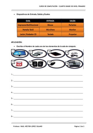 Este documento presenta una ficha de aprendizaje sobre cómo ingresar a la sala de cómputo. Explica las normas que los estudiantes deben seguir, como ingresar de forma ordenada, consumir alimentos fuera de la sala, y levantar la mano para hacer preguntas. También cubre los elementos básicos de una sala de cómputo e incluye actividades como identificar dichos elementos y completar un crucigrama.