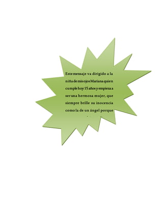Mariana cumple 15 años y empieza a convertirse en una hermosa mujer, pero que siempre conserve su inocencia como un ángel. A pesar del paso del tiempo, siempre será la niña soñada.