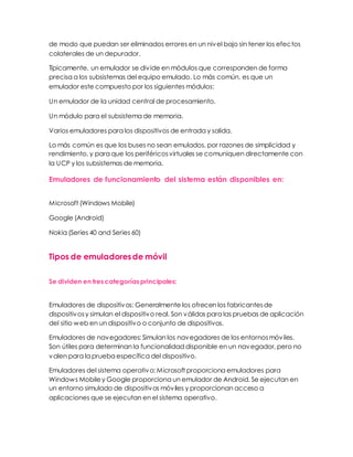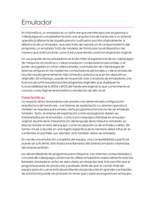 Un emulador es un software que permite ejecutar programas o videojuegos diseñados para una plataforma hardware o sistema operativo diferente. Los emuladores imitan con precisión el dispositivo original para que los programas funcionen como si se estuvieran ejecutando en el dispositivo real. Los emuladores dividen en módulos como procesador, memoria y dispositivos de entrada/salida para emular con precisión el sistema.