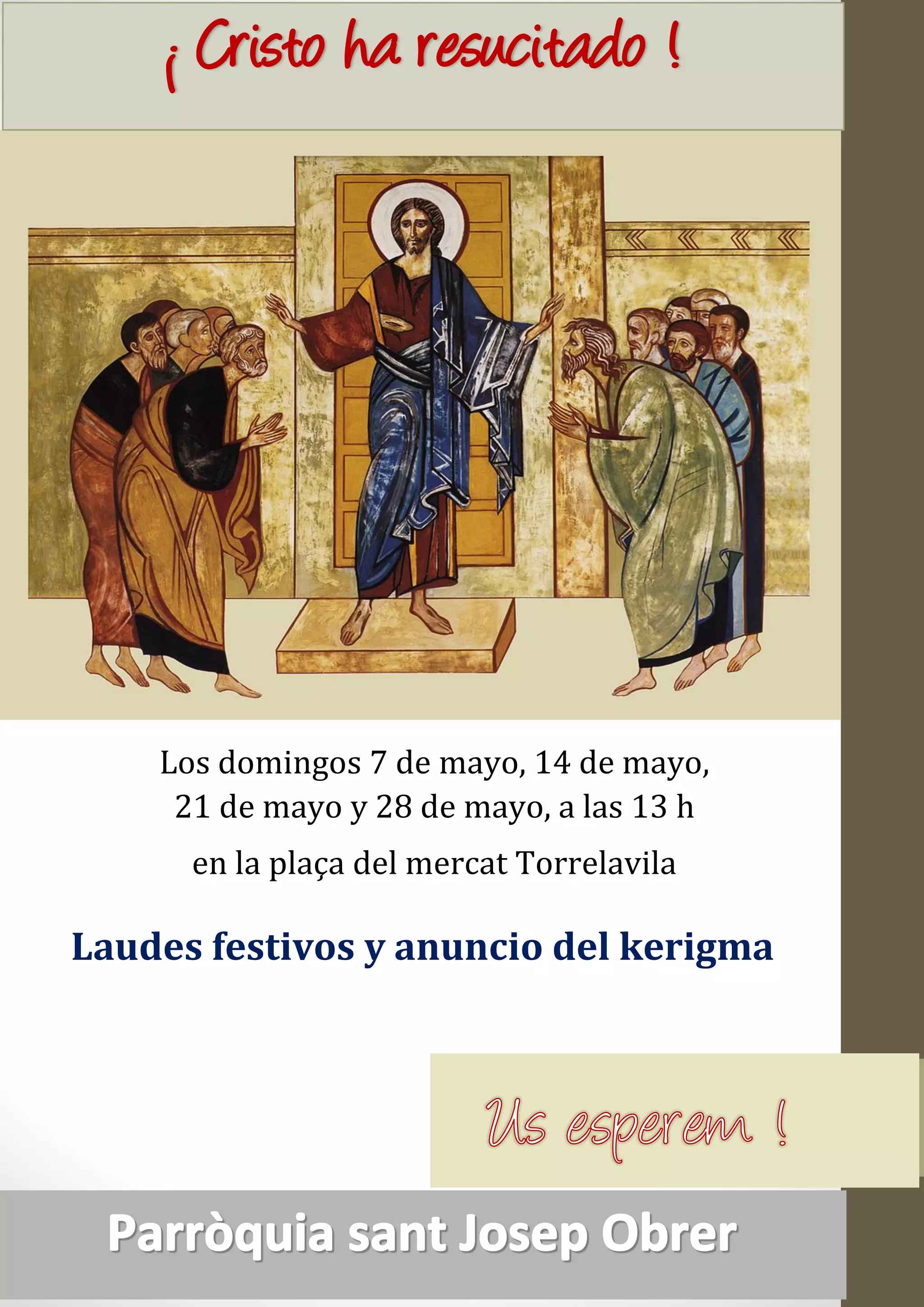 Cristo ha resucitado se anunciará en la plaça del mercat Torrelavila los domingos 7, 14, 21 y 28 de mayo a la 1 pm, con laudes festivos y el anuncio del kerigma.
