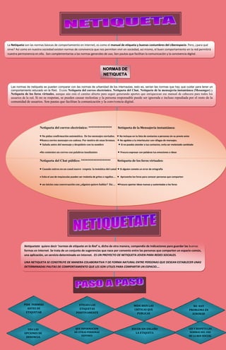 La netiqueta son las normas básicas de comportamiento en Internet que permiten una convivencia ordenada al establecer pautas para el correo electrónico, mensajería instantánea, chats y foros. Se trata de un conjunto de sugerencias que surgen de forma colaborativa entre los usuarios para facilitar la comunicación y evitar molestias. Algunas de estas normas incluyen saludar antes de enviar un mensaje, no usar mayúsculas que pueden interpretarse como gritos, y respetar los temas de discusión en cada espacio virtual.