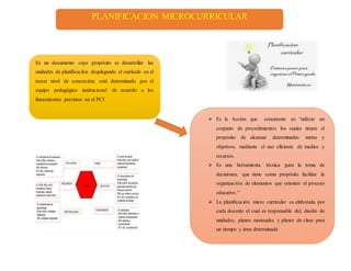 El documento describe la planificación microcurricular como un documento cuyo propósito es desarrollar las unidades de planificación para desplegar el currículo en el tercer nivel de concreción. La planificación microcurricular es elaborada por cada docente y es responsable del diseño de unidades, planes mensuales y planes de clase para un área y tiempo determinado. También introduce el concepto de planificación por competencias, el cual supone un esfuerzo de los profesores y estudiantes para enseñar y aprender vinculando la teoría con la prá