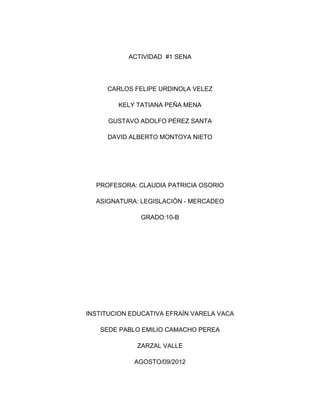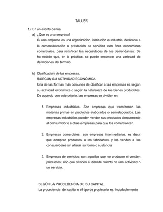 El documento presenta una actividad del taller #1 de la asignatura de Legislación - Mercadeo del grado 10B en la Institución Educativa Efraín Varela Vaca. El taller incluye definiciones de empresa, clasificaciones de empresas según su actividad económica, procedencia de capital, dimensión, cobertura y número de socios. También presenta normas y requisitos para crear una empresa como consultar registros, solicitar el riesgo único tributario y tramitar el registro único empresarial. Finalmente, define sectores y subsectores económic