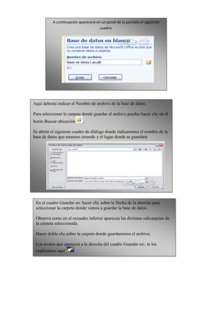 Para crear una base de datos en Access, haga clic en Nuevo, seleccione Base de datos en blanco, asigne un nombre y ubicación al archivo, y cree una tabla, que es el elemento principal para almacenar datos. Luego puede ocultar el Panel de Exploración y configurar qué objetos mostrar.