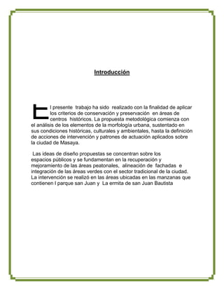 Este documento presenta una propuesta de normativa urbana para la conservación y preservación del centro histórico de la ciudad de Masaya en Nicaragua. Incluye un análisis de la morfología urbana y elementos arquitectónicos del área, así como recomendaciones sobre alturas permitidas, usos de suelo, tratamiento de esquinas, peatonalización y alineación de fachadas. El objetivo es recuperar y mejorar los espacios públicos respetando la estructura y valores históricos del lugar.