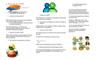 El chat se refiere a la conversación en tiempo real a través de Internet. Es sincrónico cuando los mensajes se envían y reciben instantáneamente, mientras que es asincrónico cuando los mensajes llegan con algún retraso. Las salas o canales de chat son espacios virtuales donde las personas se reúnen para conversar sobre temas específicos.