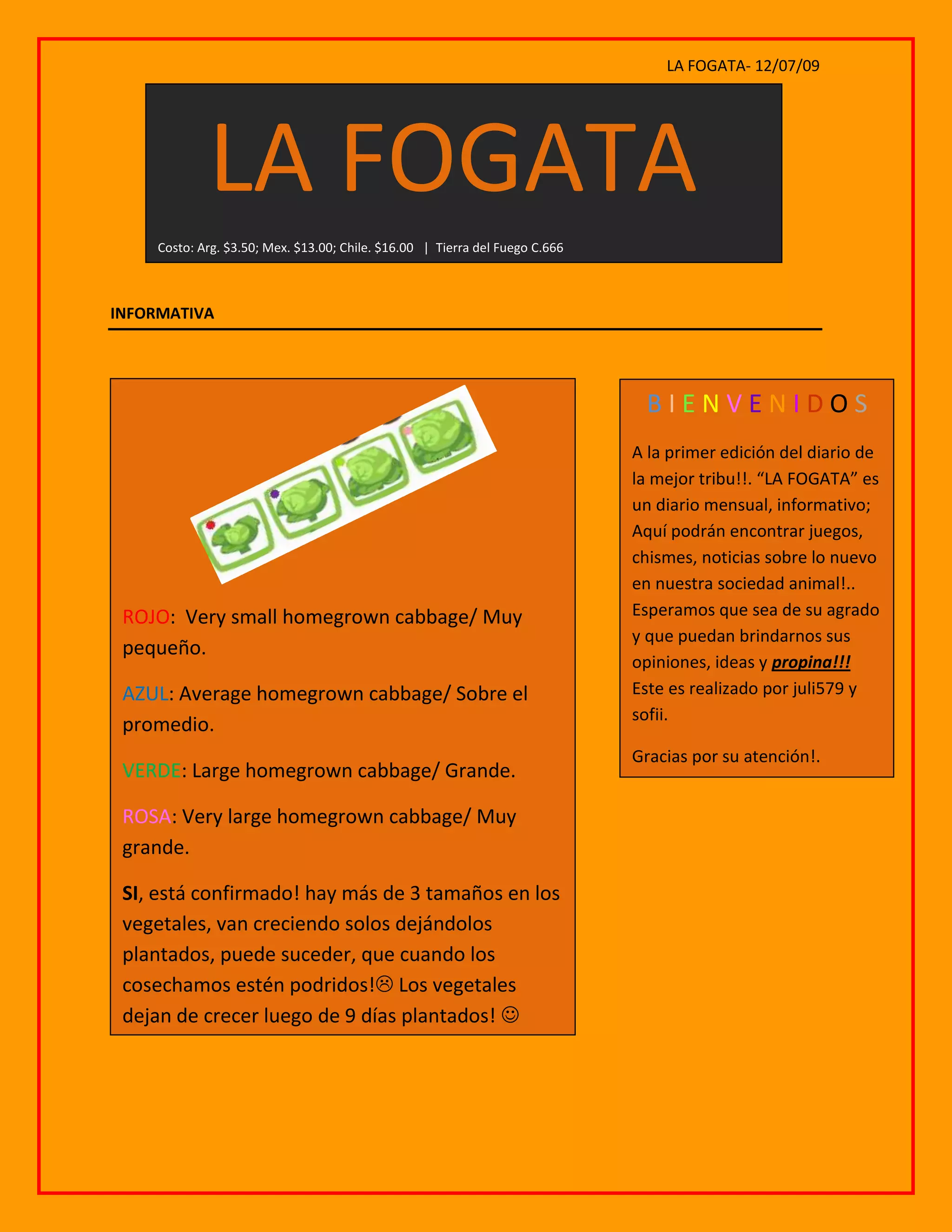 Este documento presenta el primer número de un periódico mensual llamado "La Fogata". Incluye secciones de noticias, entretenimiento, deportes y horóscopos. En la sección de chismes se insinúa que una pareja de la tribu podría tener amantes secretos. El pronóstico del tiempo predice lluvia para el lunes y martes y sol para el miércoles, jueves y viernes.