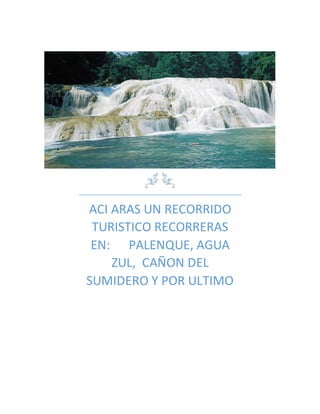 Este documento describe un recorrido turístico de 6 días que incluye visitas a Palenque, Agua Azul, Cañón del Sumidero y San Cristóbal de las Casas, con comida incluida en el Restaurante Arroyo. Después del recorrido, el grupo se hospedará en el Hotel Riu y regresará a casa al final de los 6 días.