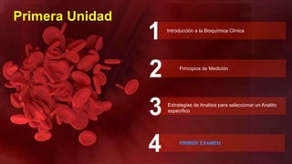 Este documento presenta una introducción a la bioquímica clínica. Explica los principios de medición como métodos ópticos como la absorbancia y potenciométricos. También describe las muestras biológicas comunes como la sangre y orina, e introduce conceptos como analitos, intervalos de referencia y calibradores.