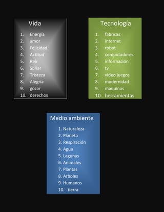 Este documento lista varios aspectos de la vida humana, la tecnología y el medio ambiente. En la sección de vida se enumeran conceptos como el amor, la felicidad y la alegría. La sección de tecnología incluye items como internet, computadoras y videojuegos. La última sección sobre medio ambiente contiene elementos naturales como la naturaleza, el agua, los animales y la tierra.