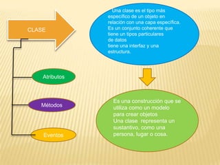 El documento describe varios temas relacionados con la programación orientada a objetos. Explica que una clase define el tipo de un objeto y sus características como atributos y métodos. También habla sobre herencia, polimorfismo y eventos en programación orientada a objetos. Finalmente, introduce conceptos de interfaz de hardware, software e interfaz de usuario.