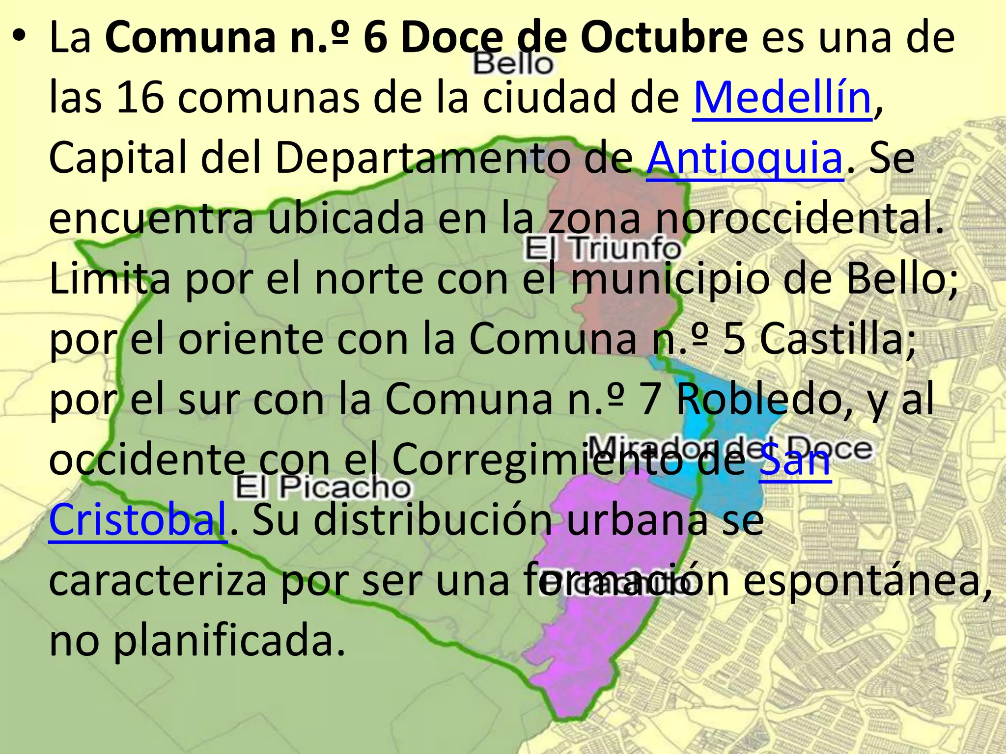 Este documento proporciona información sobre la historia, geografía, demografía, etnografía y economía de la Comuna 6 Doce de Octubre en Medellín, Colombia. Se describe que la comuna se formó de manera espontánea en las décadas de 1930-1950 y experimentó un rápido crecimiento urbano en las décadas posteriores. La comuna tiene una población joven de 192,656 habitantes y está compuesta principalmente por mestizos y blancos. Carece de una estructura económica desarrollada y su infra