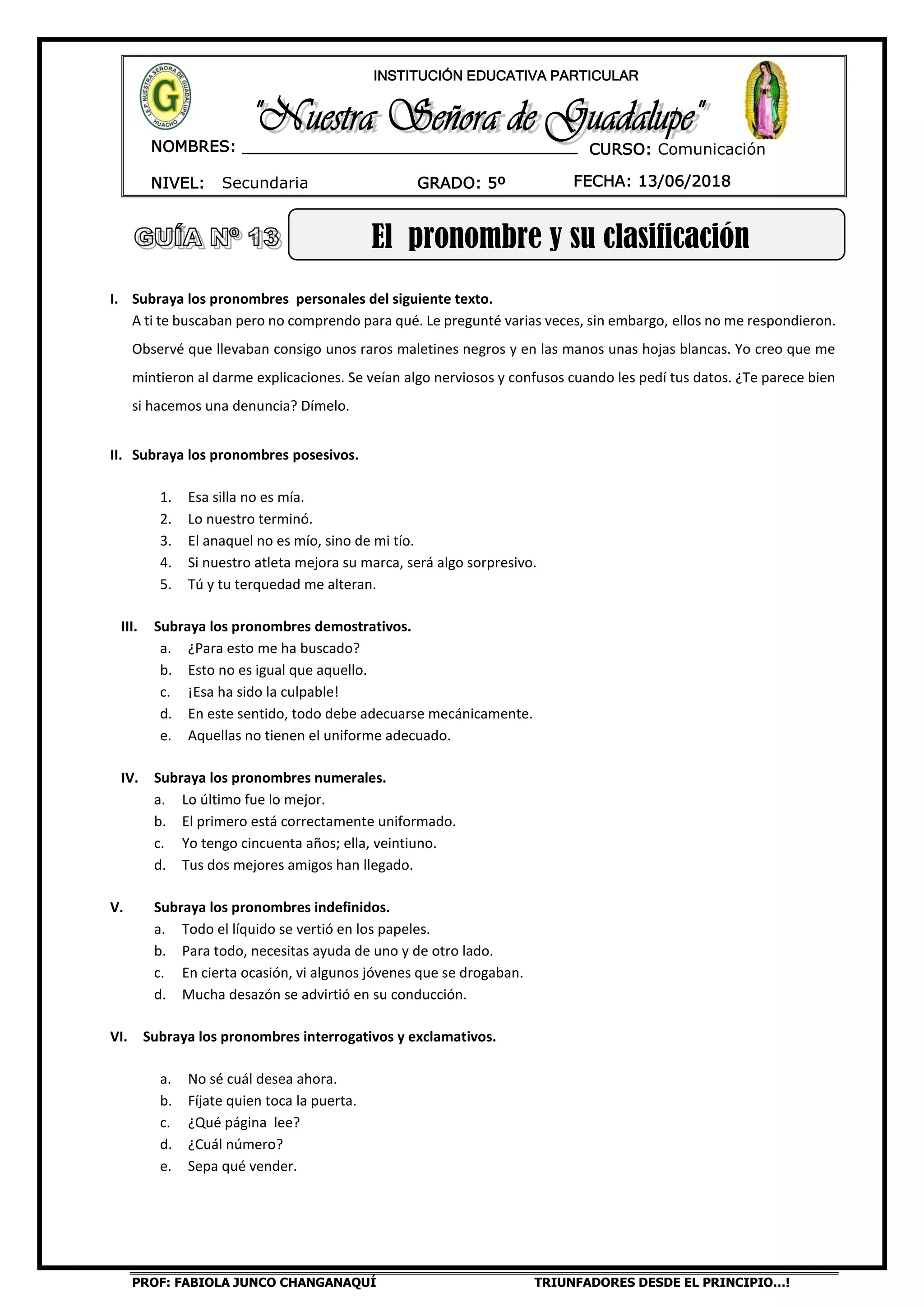 Este documento presenta un resumen de las diferentes clases de pronombres y ejercicios para identificar y usar correctamente pronombres personales, posesivos, demostrativos, numerales, indefinidos, interrogativos y exclamativos. El documento contiene 13 secciones con instrucciones y oraciones de ejemplo para que los estudiantes subrayen, completen, identifiquen y reemplacen diferentes tipos de pronombres.